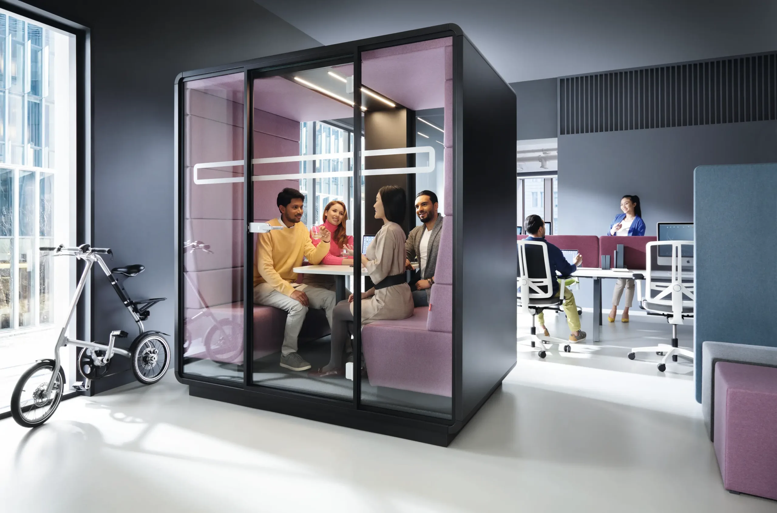 Akustik toplantı kabini, ses yalıtımı sağlayarak dış gürültüyü engelleyen ve iç sesin dışarı çıkmasını önleyen, genellikle taşınabilir bir kabin sistemidir. Özellikle açık ofis planlarında çalışanların gizlilik ihtiyacını karşılamak ve dış ses kaynaklarından izole bir toplantı ortamı oluşturmak için idealdir.
